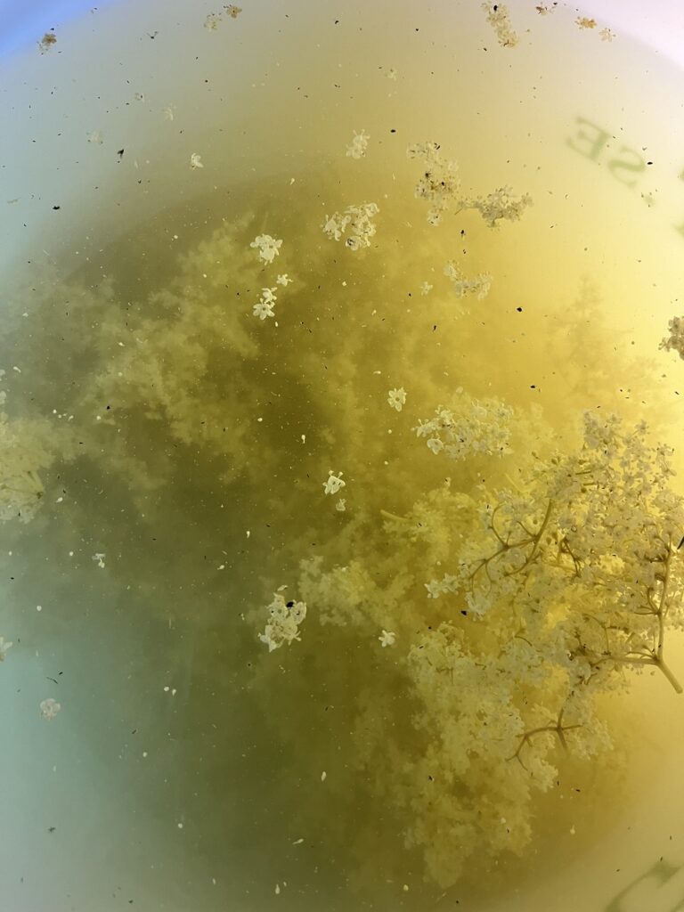 Jäs ca en vecka, ta bort fläderblommorna och låt det fortsätta jäsa.